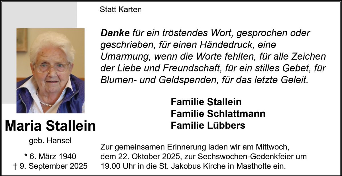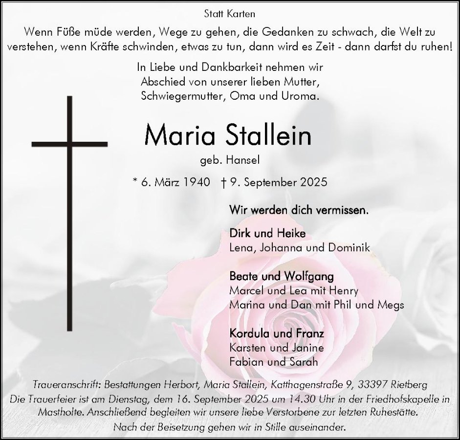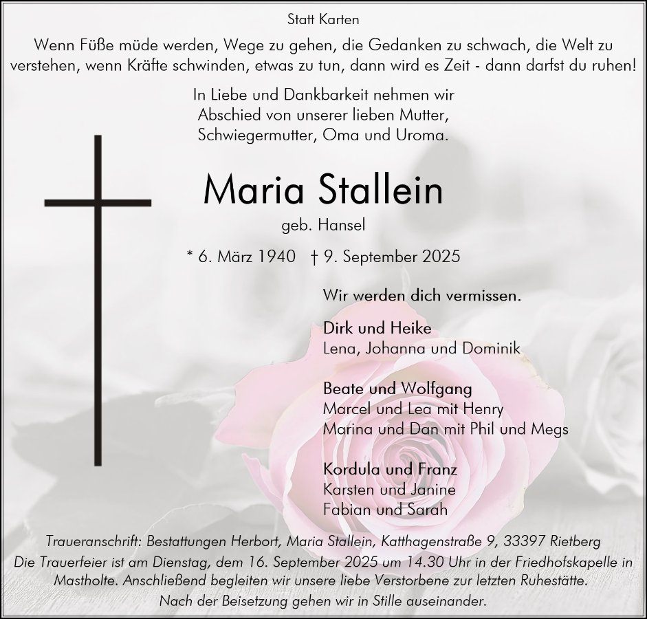 Wir möchten Euch unsere Anteilnahme zum Tod von Maria aussprechen .Wir werden uns immer gerne an gemeinsame vergangene Jahre erinnern. LG Josef, Cilly , Gabi und Rolf .